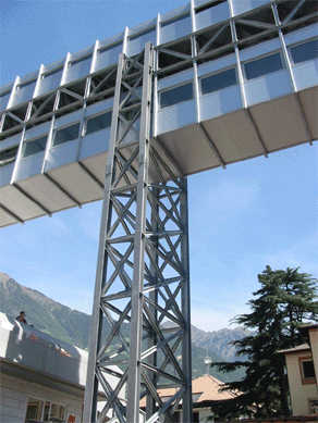 DI DIVERSA TIPOLOGIA I LAVORI ESEGUITI PER LA RISTRUTTURAZIONE DEL VECCHIO OSPEDALE DI MERANO. ALL'INGRESSO DELL'EDIFICIO E ' STATA REALIZZATA UNA FACCIATA CONTINUA DI 20 X 22 MT. DI DIMENSIONI, CON UNA SOTTOSTRUTTURA IN ACCIAIO, FISSATA SOLO PERIMETRALMENTE. UN PONTE COSTITUITO DA UNA TRAVE RETICOLARE PORTANTE E DA DUE TUNNEL POSIZIONATI RISPETTIVAMENTE SULL'INTRADOSSO E L'ESTRADOSSO DI TALE TRAVE, COSTITUISCE ELEMENTO DI COLLEGAMENTO TRA L'OSPEDALE VECCHIO E QUELLO NUOVO. ALL'INTERNO DELL'OSPEDALE SONO STATI REALIZZATI IN CRISTALLI TEMPERATI E SOSTEGNI E FINITURE IN ACCIAIO INOX SATINATO, TUTTI I PARAPETTI DELLE SCALE E DEI PIANI | SULLA SOMMITA' DELL'EDIFICIO E' STATO REALIZZATO UN ELIPORTO DI 26 MT DI DIAMETRO PER UN PESO COMPLESSIVO DI 200 TONNELLATE.